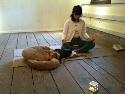 この写真では、私が瞑想をはじめた直後にとことこやってきて、ベッドに頭をのせて、自然にくつろぎ始めました。動物は、気に敏感です。
